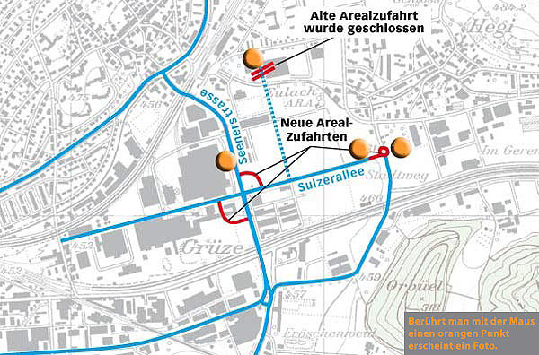Die Karte zeigt die Hauptstrassen, die Sammelstrasse Sulzerallee, die neuen Arealzufahrten und das geschlossene Strassenstück bei der alten Sulzerkantine.
