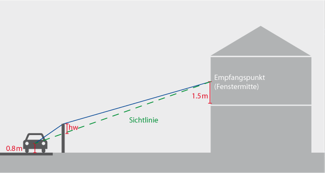 Die wirksame Höhe hw der Lärmschutzwand oder des Lärmschutzwalls beschreibt, wie weit die Lärmschutzwand über die Sichtlinie hinausragt.