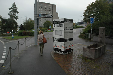 Wer fährt, liest nicht. Wer motorisiert ist, geht manchmal auch zu Fuss. Und wer zu Fuss geht, fährt bisweilen auch. Zur Unterstützung und Erklärung der Lärmdisplays werden deshalb an geeigneter Passantenlage Informationsträger (Stellwände mit Flyer-Kisten, beide in Form und Farbe dem Display nachempfunden) aufgestellt. Interessierte erfahren in kurzer und prägnanter Form (Text und Grafik) das Wichtigste zum Thema Lärm, Stichworte: "Lärm ist subjektiv", "Lärm macht krank", "Kombinieren statt fluchen und pressieren" und anderes.