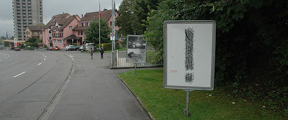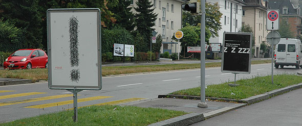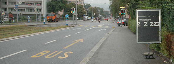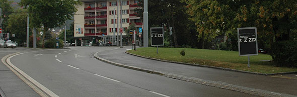 Um auch die Motorfahrzeug Lenkenden direkt anzusprechen, werden ausserdem Plakat-Tafeln am Strassenrand aufgestellt. Sie appellieren an die Rücksichtnahme der Individuell Motorisierten gegenüber den Ruhe Bedürftigen, insbesondere gegenüber den Schlaf Suchenden im Strassenlärm der Nacht.